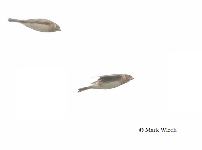 After a few hours of sleep I awoke to find a message on my phone from Dave, in which he reported that a White-rumped Sandpiper was in the company of the aforementioned Plover at the harbor. I packed up the camera and headed back out there. When I arrived I saw a distant flock of about a dozen birds flying by and snapped a couple of poorly lit, underexposed photos. Upon review, once they were downloaded on the computer I could see that they were Lapland Longspurs.